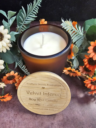 Velvet Inferno is a bold and seductive scent that envelops you in a rich, luscious aroma. The top and middle notes of juicy black cherry create a deep, indulgent sweetness that captures attention and ignites the senses. As it settles, smooth vanilla rounds out the fragrance, adding a creamy softness that balances the intensity of the cherry. Light this candle to infuse your space with an irresistible warmth and a hint of mystery, perfect for cozy evenings or romantic gatherings.